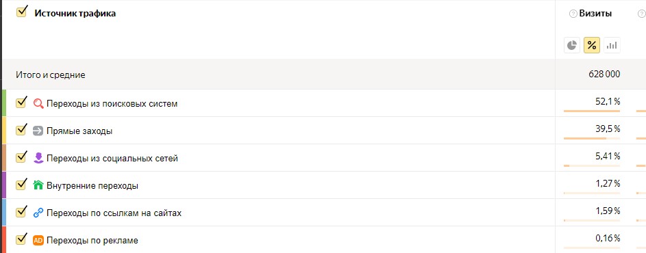 52,1% переходов из поисковых систем, а это 327 000 визитов в год. И 39,5% составляет около 248 000 визитов по прямым заходам.